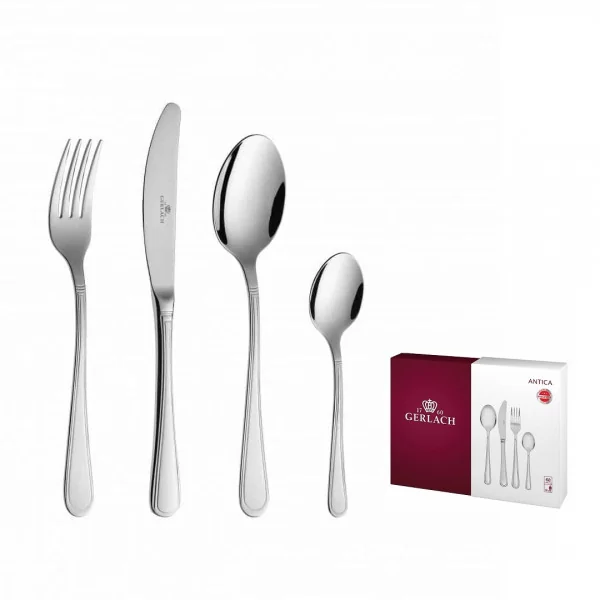 Wykonane zostały z wysokiej jakości stali nierdzewnej 18/10. Stal o tych parametrach cechuje się dużą odpornością na korozję, a także dzięki zawartości chromu i niklu w odpowiednich proporcjach (18 Chr, 10 Ni) daje się ją polerować na bardzo wysoki połysk. Nóż natomiast wykonany jest ze stali X50CrMoV15, dzięki czemu może zostać naostrzony w odpowiedni sposób. Nie tylko jakość, ale i grubość stali jest również bardzo ważna. Dzięki użyciu stali o grubości 2,2 mm do produkcji sztućców Antica ,są wytrzymałe i nie wyginają się pod naciskiem podczas jedzenia. Doskonała jakość użytej stali sprawia, że sztućce nie wchodzą w reakcję z kwasami występującymi w pożywieniu, mają wieczystą gwarancję Gerlacha i można je myć w zmywarce.