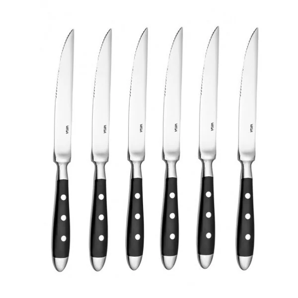 Komplet 6 noży stekowych z nitowanymi rękojeściami w kolorze czarnym.