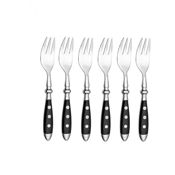 Komplet widelczyków deserowych z nitowanymi rękojeściami w kolorze czarnym.