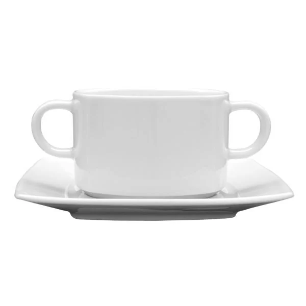 Porcelanowa bulionówka z uszami ze spodkiem o pojemności 320 ml. Idealna do podania każdego rodzaju zupy tradycyjnej lub zup kremów. Dzięki swojemu prostemu stylowi będzie pasowała do każdego wnętrza. Sprawdzi się zarówno na co dzień jak i podczas rodzinnych uroczystości.