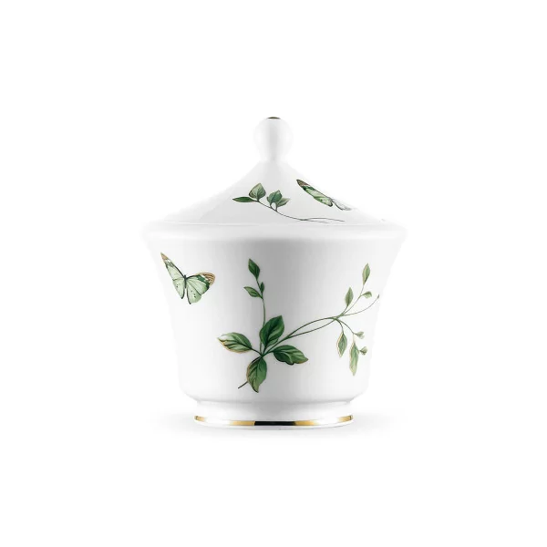 Kultowy fason Margaret porcelany Ćmielów odtworzony został na podstawie projektów autorstwa cenionego artysty Wincentego Potackiego, który przez wiele lat był związany z tą fabryką porcelany. Margaret w dekoracji Magiczny Ogród to klasyczna, śnieżnobiała porcelana zdobiona subtelnymi, roślinnymi elementami w odcieniach zieleni, z ręcznie malowaną złotą linią wokół brzegów naczyń. Dekorację G665 tworzą ciemnozieloneliście z połyskującymi, ręcznie malowanymi, złotymi detalami oraz uroczy motyl, który również uwydatniony jest wysokokaratowym złotem.