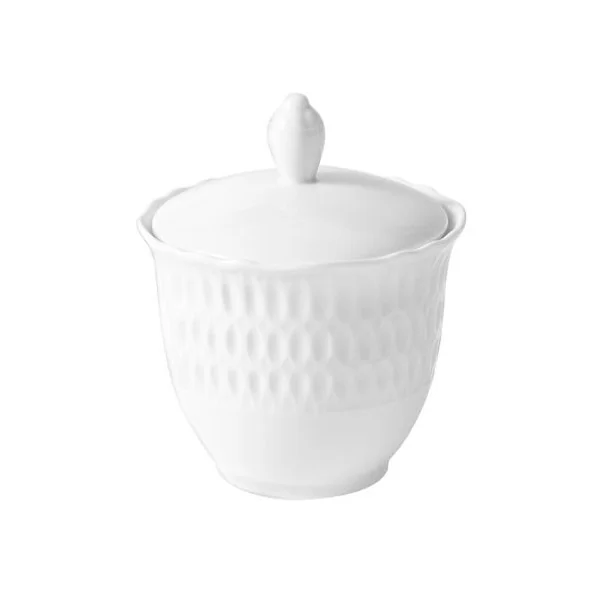 Cukiernica porcelanowa z pokrywką z subtelnymi żłobieniami. W cukiernicy można podać zarówno cukier sypki jak i w kostkach. Cukiernica sprawdzi się na co dzień jak również podczas uroczystych przyjęć.