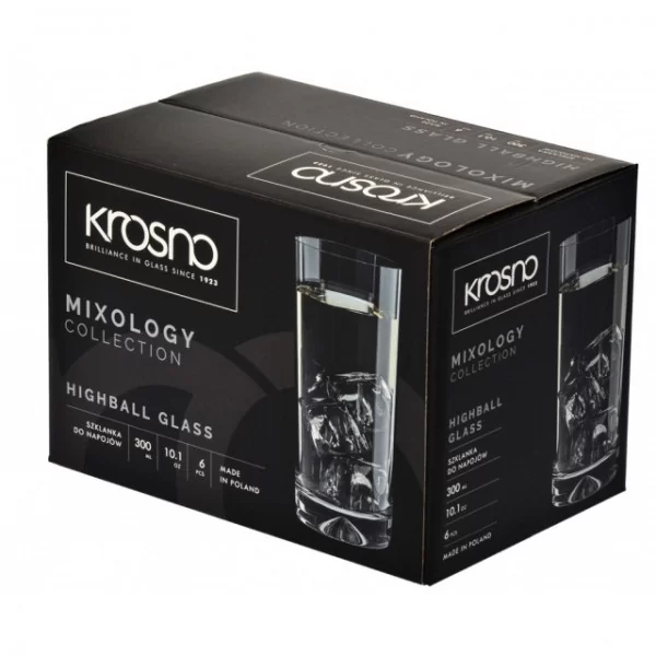 Szklanki wysokie do drinków o pojemności 300 ml. Producentem wyrobu są Krośnieńskie Huty Szkła KROSNO S.A.
