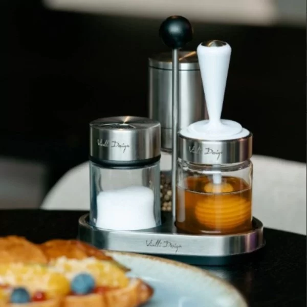 Zestaw do przypraw i miodu na podstawce. Wykonany ze stali nierdzewnej, tworzywa sztucznego oraz szkła. Bardzo poręczny i funkcjonalny zestaw. Dzięki specjalnej łyżeczce nakładanie miodu nie będzie sprawiać trudności. Zestaw będzie ozdobą zarówno blatu w kuchni jak i stołu w jadalni.