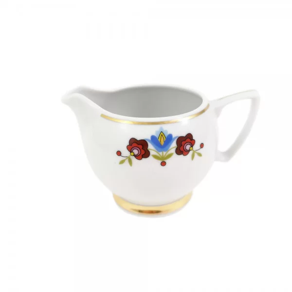 Dzbanek do mleka, mlecznik o pojemności 150 ml. Dekoracja wdzydzka, regionalna, ze złotem na fasonie Ambasador Porcelany Lubiana.