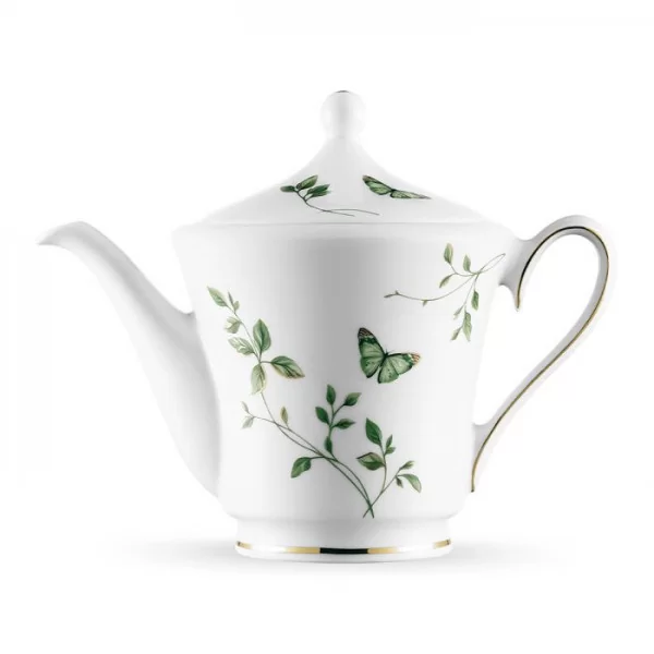 Dzbanek do kawy i herbaty o pojemności 1000 ml, wykonany z białej porcelany, dekorowany subtelnym motywem roślinnym i złotą linią.