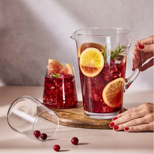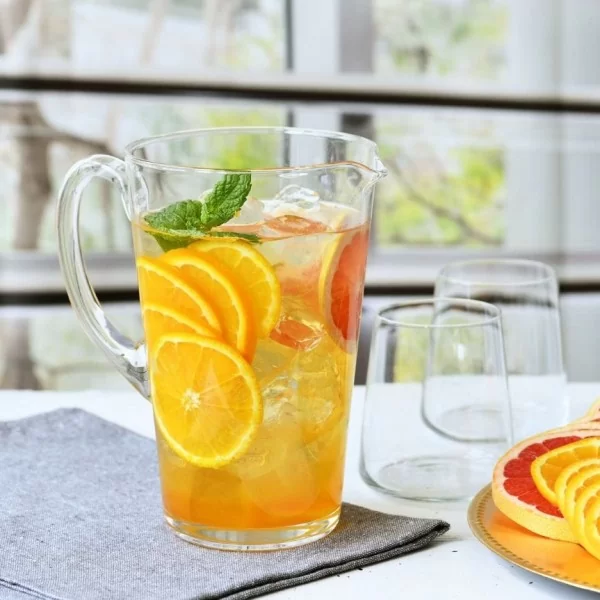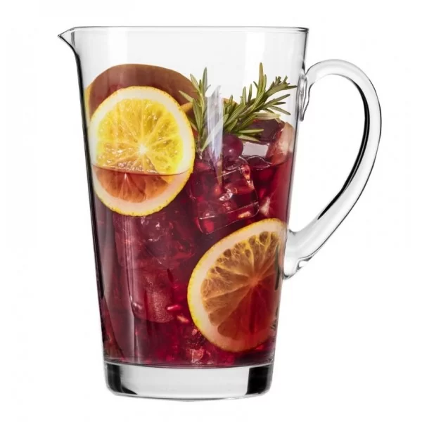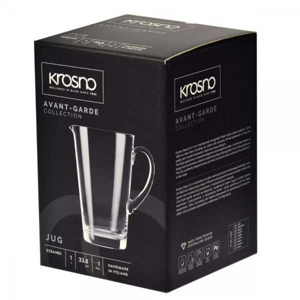 Szklany dzbanek lekko rozchylony w kształcie stożka do serwowania soków, wody i zimnych napojów o pojemności 1 litra z kolekcji Avant-Garde, wyprodukowany przez polską markę Krosno Glass. Szkło Crystalline jest mocne i trwałe na uszkodzenia mechaniczne, dodatkowo jest bardzo przejrzyste, co czyni go wyjątkowym.