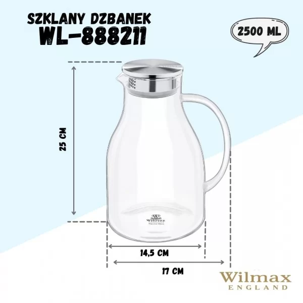 Dzbanek szklany o pojemności 2500 ml. Wykonany ze szkła żaroodpornego. Producentem wyrobu jest firma WILMAX.