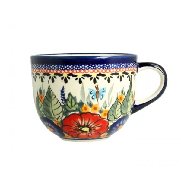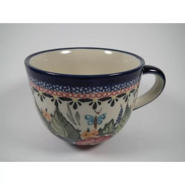 Filiżanka od Zakładów Ceramicznych Bolesławiec, w dekoracji artystycznej 149ART. Charakteryzuje się większą, niż pozostałe dekoracje, ilością wzorów i kolorów. W przypadku tej dekoracji mamy motyle latające nad łąką oraz dopełnienie w postaci różnorodnych wzorów dookoła naczynia.