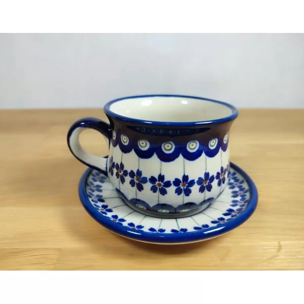 Filiżanka ze spodkiem od Zakładów Ceramicznych Bolesławiec, w dekoracji o podwyższonym standardzie. Charakteryzuje się ona dużą ilością kobaltowych kółek w pawim okiem w środku oraz kwiatkami przypominającymi goździki.