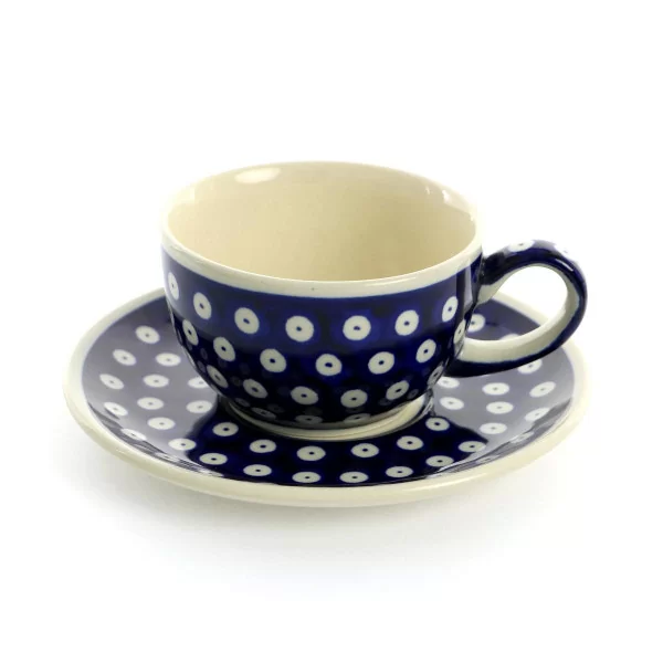 Ceramiczna filiżanka ze spodkiem o pojemności 210 ml, dekorowana ręcznie metodą stempelkową, motywem w kolorach kobaltu. Kolekcja 42 Kropki Zakładów Ceramicznych Bolesławiec.