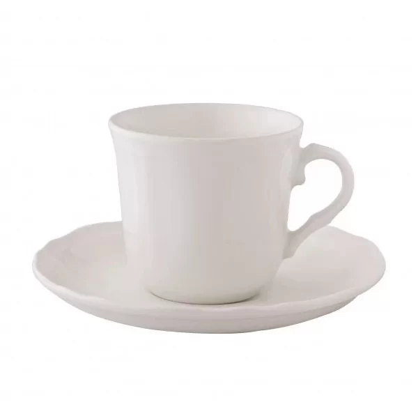 Filiżanka do herbaty ze spodkiem w stylu retro, wykonana z porcelany w ciepłym kremowym kolorze. Posiada subtelne reliefy podkreślające jej kształt i misternie rzeźbione uszko. Doskonale sprawdzi się przede wszystkim w gastronomii, choć z powodzeniem może pełnić rolę zastawy domowej.