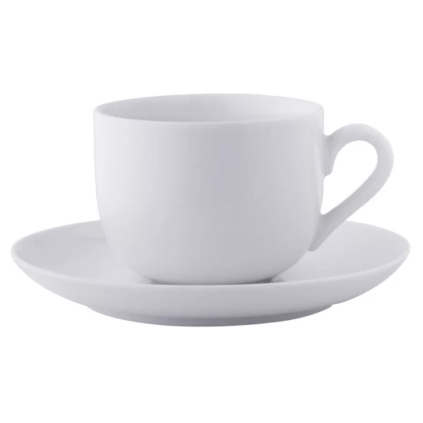 Porcelanowa filiżanka typu "jumbo" ze spodkiem, o pojemności 450 ml., fason Nora. Wykonana z niedekorowanej porcelany w kolorze białym od Zakładów Porcelany Stołowej "Karolina" z Jaworzyny Śląskiej.