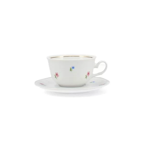 Filiżanka ze spodkiem z delikatnym motywem kwiatowym oraz złotym paskiem. Wykonana z białej porcelany. Producent Lubiana.