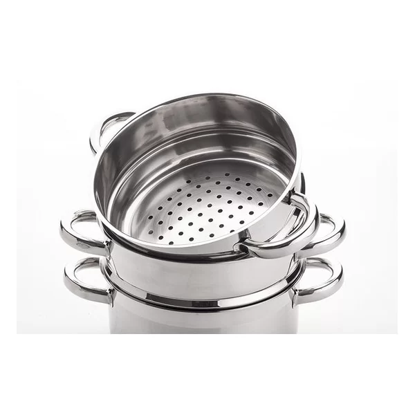VITALO to kolekcja garnków 4-częściowych (zestaw 2 wkładów i szklana pokrywka) przeznaczona do zdrowego gotowania na parze, wykonana ze szlachetnej stali nierdzewnej. Jedwabiście matowe na zewnątrz z wypolerowanymi pasami oraz termoizolacyjnymi uchwytami. Garnek wyposażony jest w szklaną pokrywkę z chromowanym brzegiem oraz uchwytem termoizolacyjnym ze stali szlachetnej i otworem ujścia pary. Wielowarstwowe i termiczne dno sprawia, że garnek szybko się nagrzewa i utrzymuje ciepło.