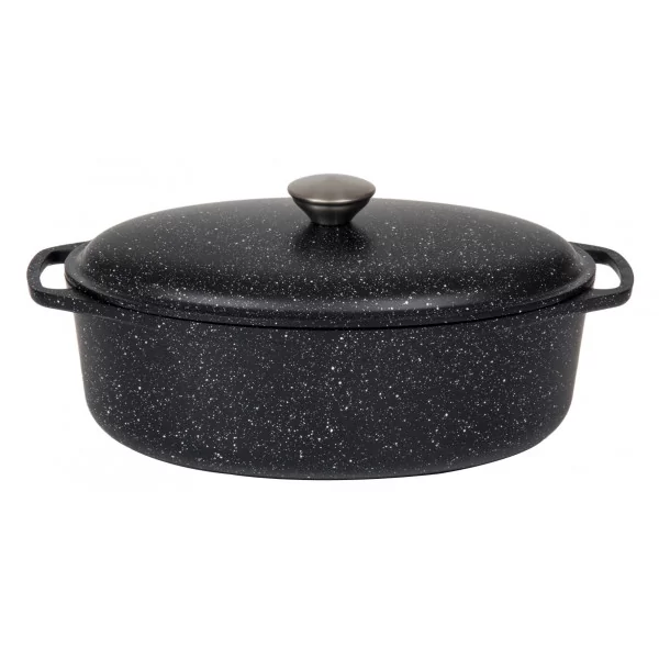 Wykonana z wysokiej jakości odlewów aluminiowych owalna brytfanna. Pokrywa posiada uchwyt zw stali nierdzewnej. Wysokiej jakości powłoka wewnętrzna zapobiega przywieraniu. Brytfanna idealna jest do zdrowego duszenia i pieczenia mięs lub ryb. Można w niej również smażyć np. powidła.