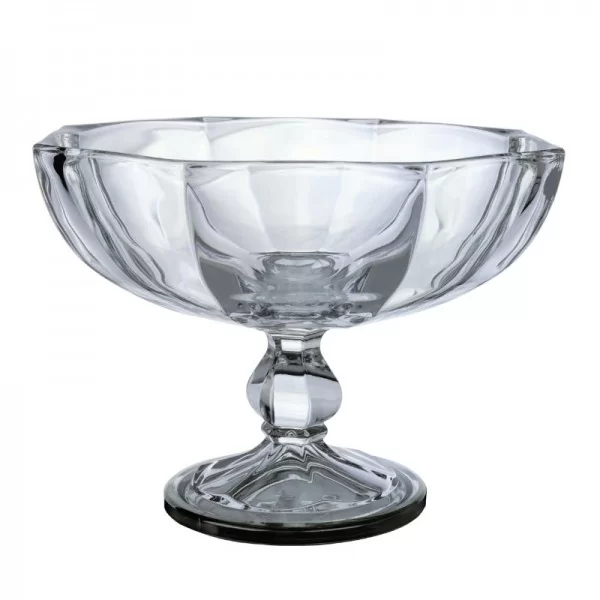 Dekoracyjna owocarka na nodze z kolekcji Hamburg, wykonana z krystaliny. Noga posiada srebrną obwódkę. Doskonale nada się do podania ciastek lub owoców.