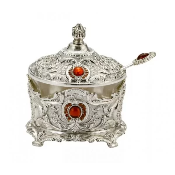 Przepiękna cukiernica z łyżeczką. Wykonana z wysokiej jakości metalu, którego zewnętrzna powłoka została poddana platerowaniu.