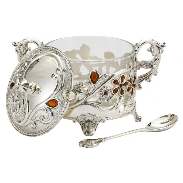 Przepiękna cukiernica z łyżeczką. Wykonana z wysokiej jakości metalu, którego zewnętrzna powłoka została poddana platerowaniu.