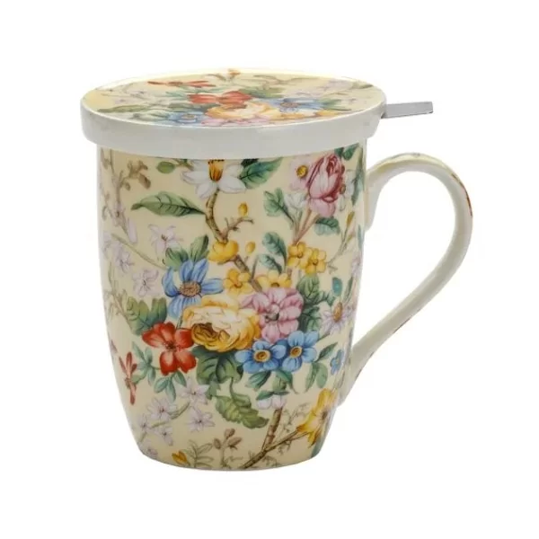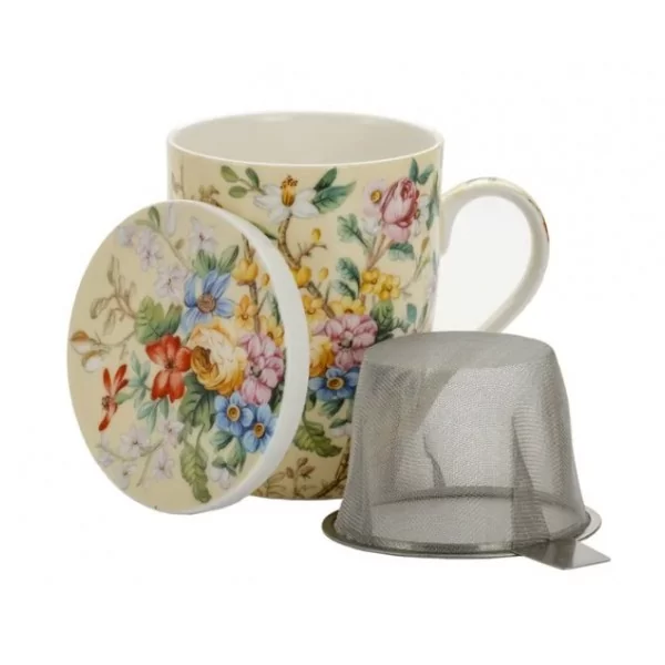 Porcelanowy kubek o pojemności 450 ml z zaparzaczem i przykrywką. W zestawie znajduje się stalowy zaparzacz do herbaty liściastej, który umożliwia wygodne parzenie ulubionych naparów bez fusów. Praktyczna pokrywka nie tylko utrzymuje ciepło napoju, ale może również służyć jako podstawka pod zaparzacz po jego wyjęciu.