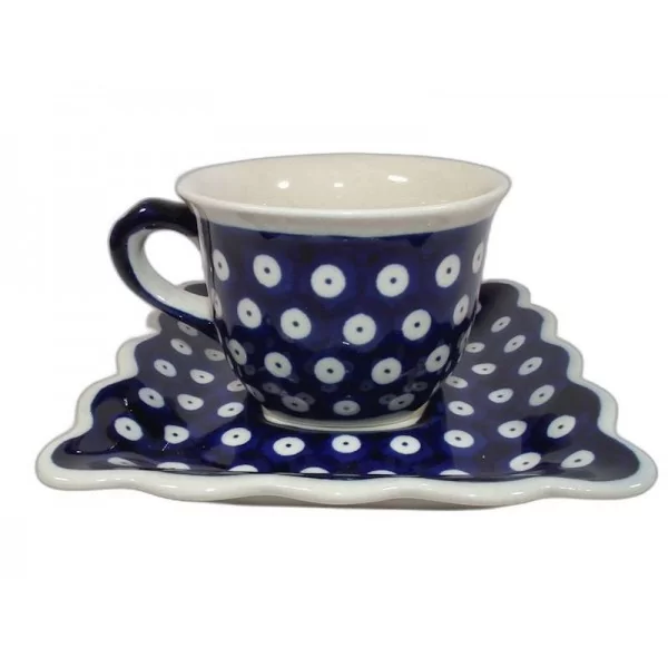 Filiżanka ceramiczna o pojemności 150 ml z kwadratowym spodkiem, dekorowana ręcznie metodą stempelkową, motywem w kolorach kobaltu od Zakładów Ceramicznych Bolesławiec.