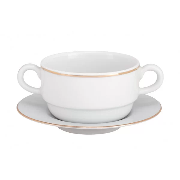 Sztaplowana bulionówka z uszami o pojemności 280 ml, bez spodka. Pasuje spodek w fasonie Planet Złoty o średnicy 15 cm. Porcelana biała zdobiona złotą linią. Kolekcja Planet Gold produkowana na naszą wyłączność przez ZPS Karolina.