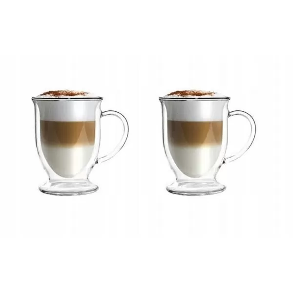 Komplet dwóch szklanek marki Vialli Design wykonanych ze szkła żaroodpornego, borokrzemowego. Szklanki wykonane są w technologii Double Wall. Zastosowanie podwójnych ścianek ze szkła żaroodpornego sprawia, że napój wewnątrz naczynia dłużej zachowuje swoją temperaturę, a zewnętrzna część nie parzy w dłoń.