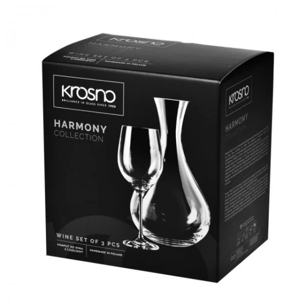 Zestaw do wina składający się z karafki oraz dwóch kieliszków do wina czerwonego. Wykonane ze szkła sodowego formowanego tradycyjną metodą ręczną. Karafka i kieliszki pochodzą z kolekcji Harmony, którą cechują smukłe i eleganckie kształty.