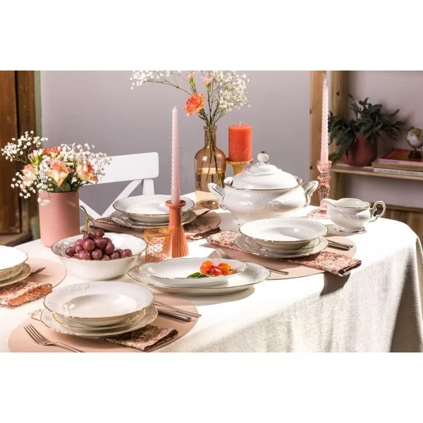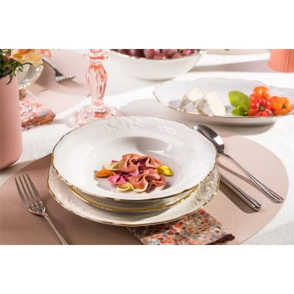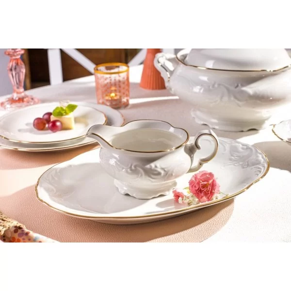 Zestaw obiadowy z kolekcji Fryderyka Ivory stanowi doskonałą propozycję dla miłośników porcelany w delikatnym odcieniu kości słoniowej, uzyskanym dzięki precyzyjnemu procesowi szkliwienia. Każdy element zastawy został starannie ozdobiony reliefem roślinnym oraz ręcznie malowanym złoceniem, co nadaje mu niepowtarzalnego uroku. Estetyka tej zastawy nawiązuje do bogactwa i przepychu charakterystycznego dla epoki baroku, dzięki czemu będzie eleganckim dodatkiem do każdego stołu, podkreślając wyjątkowy charakter spotkania.