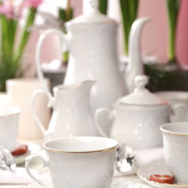 Rococo to jeden z najstarszych fasonów porcelany w Polsce. Projekt pochodzi z XIX wieku i jest potwierdzeniem ponadczasowości klasycznych wzorów porcelany. Cechą charakterystyczną fasonu są ornamentowe zdobienia przypominające muszle. Dekoracja Złota Linia (3604) to subtelna, złota kreska wokół brzegów porcelanowych naczyń. Tak niewiele trzeba, by uwydatnić i podkreślić piękno cienkosciennej porcelany z muszelkowym reliefem.