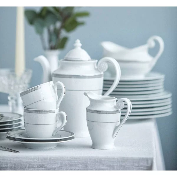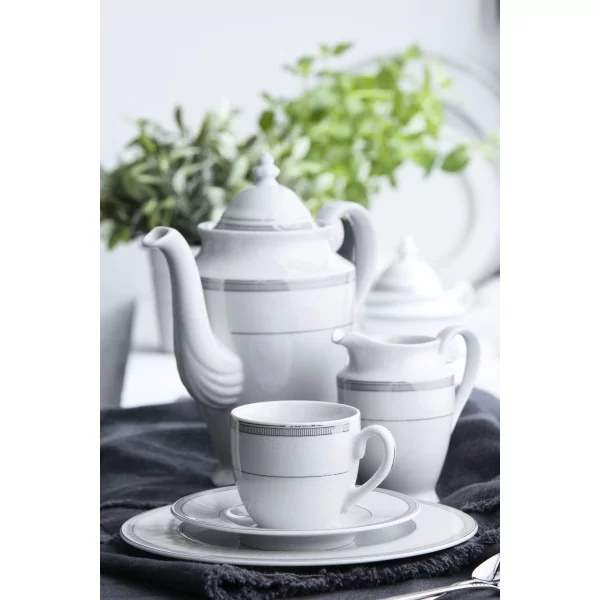 Elegancki serwis kawowy dla 12 osób, wykonany z białej porcelany, dekorowany delikatna kalką i platynową linią. Doskonale sprawdzi się zarówno w klasycznych wnętrzach jak również i nowoczesnych. Będzie elegancką ozdobą podczas uroczystego przyjęcia jak również i na co dzień.