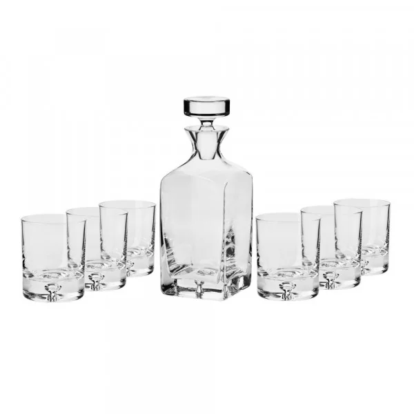 Komplet 7-częściowy do whisky z dawnej kolekcji SAGA. Producentem są Krośnieńskie Huty Szkła KROSNO S.A.
