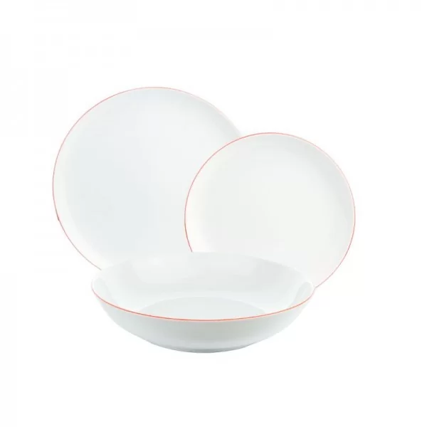 Komplet talerzy dla 6 osób, 18-elementowy. Wykonany z białej porcelany dekorowany subtelną czerwoną linią. Kolekcja Base Red od marki Bogucice idealnie odpowiada na potrzeby klientów, którzy zaopatrzeni byli w słynną czerwoną linię z Zakładów Porcelany Stołowej Karolina.