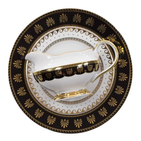 Serwis obiadowy dla 6 osób, 25-elementowy, dekorowany w kolorach czerni i złota, z wazą w komplecie. Będzie pięknie się prezentował na stole podczas rodzinnych uroczystości.
