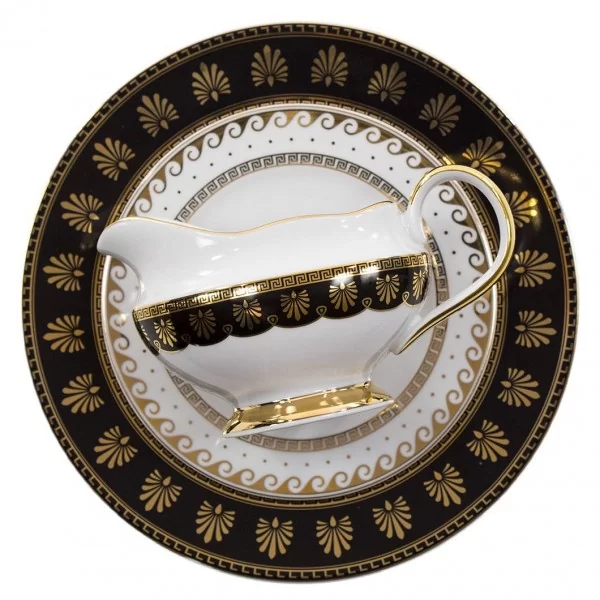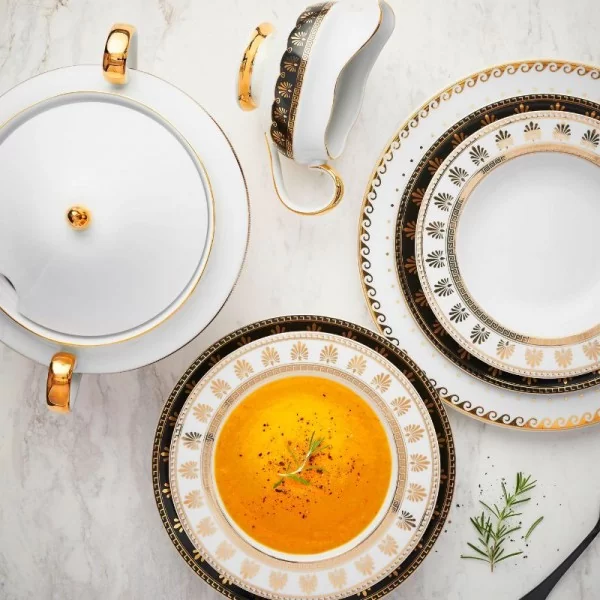 Komplet talerzy dla 6 osób dekorowane w kolorach czerni i złota. Będą pięknie się prezentowały na stole podczas rodzinnych uroczystości.