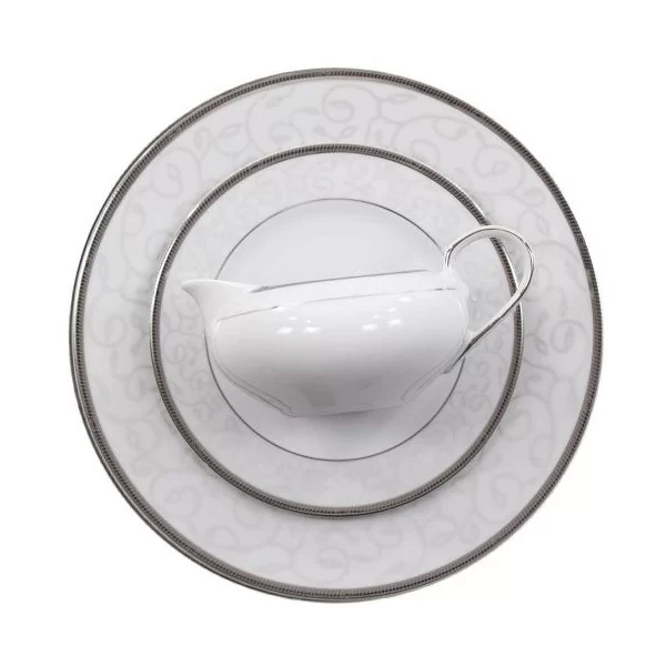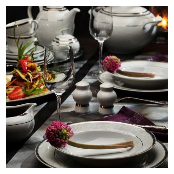 Serwis obiadowy dla 12 osób, 44-elementowy, subtelnie zdobiony platyną, bez wazy w komplecie. Serwis będzie pięknie się prezentować na stole podczas uroczystego rodzinnego spotkania. Dzięki swojej delikatności pasuje do każdego wystroju stołu.