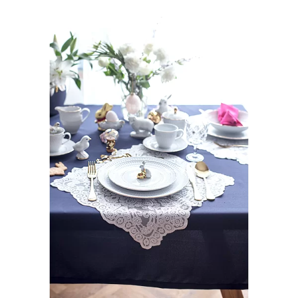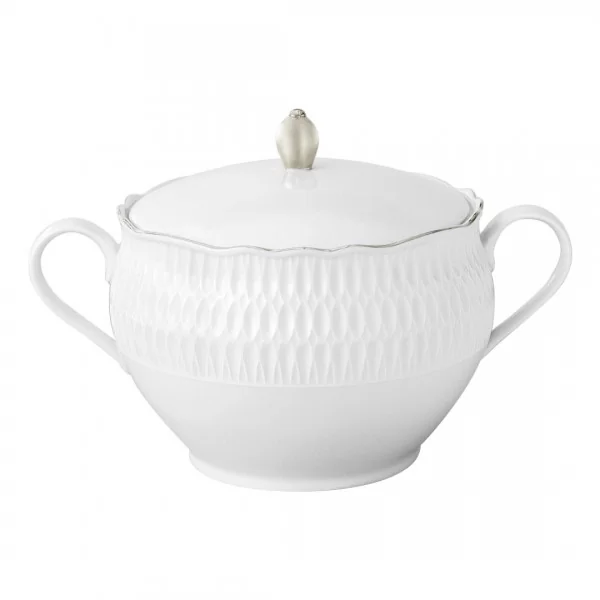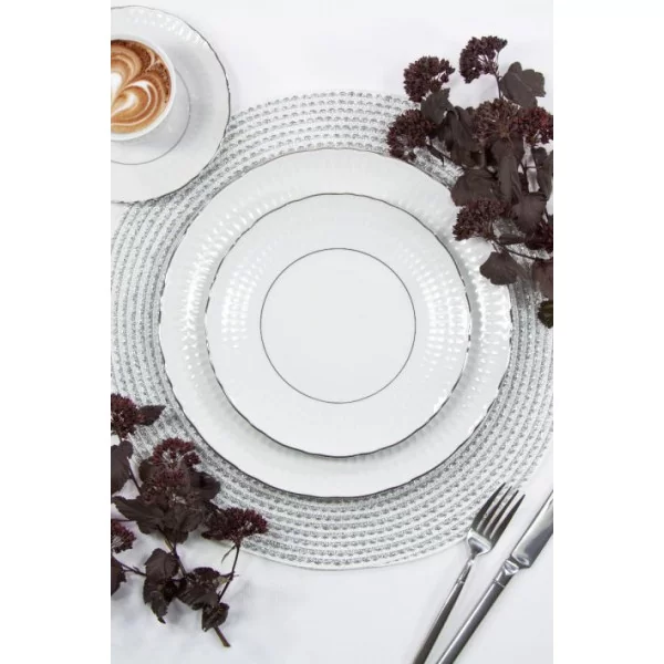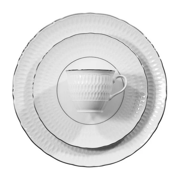 Piękny, romantyczny serwis obiadowy 6-osobowy, 25-elementowy. Rozbudowany zestaw porcelanowy posiada w swoim składzie wazę, sosjerkę, półmiski i salaterki. Okrągłe kształty naczyń i geometryczny relief doskonale uzupełniają platynowe zdobienia.