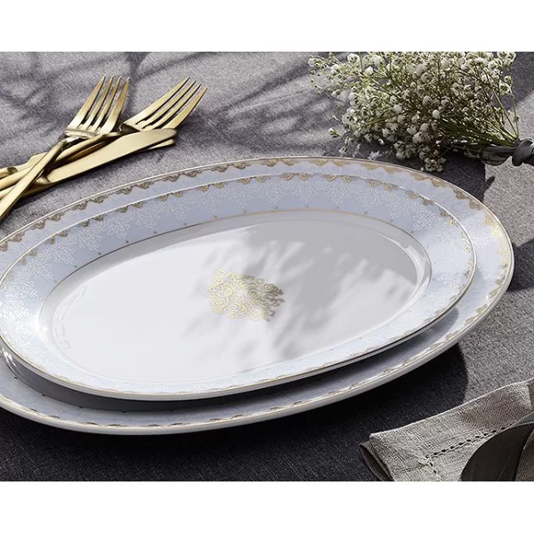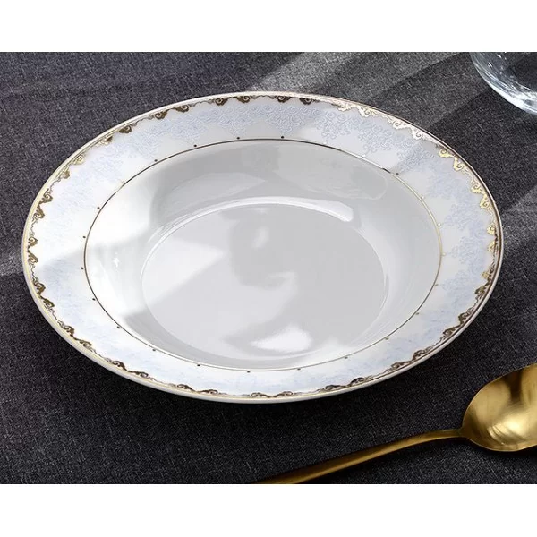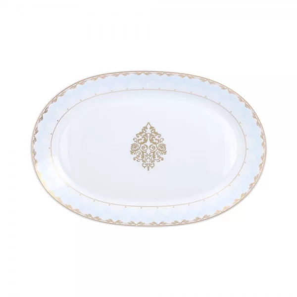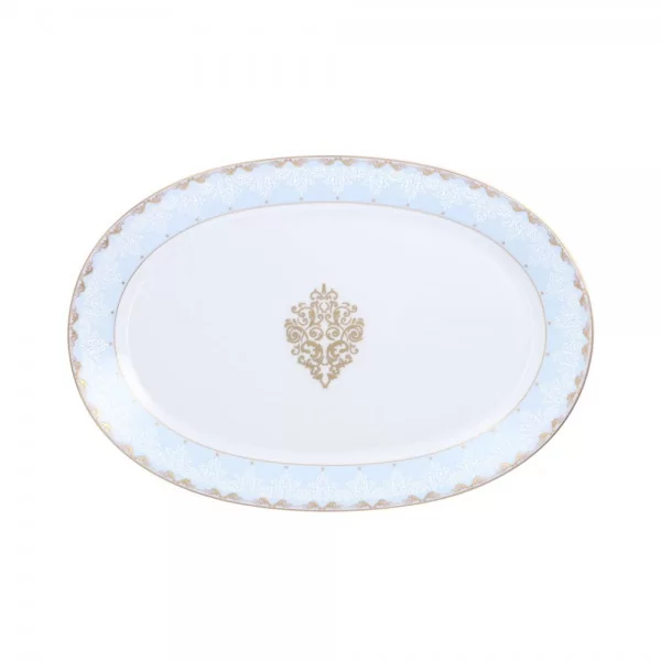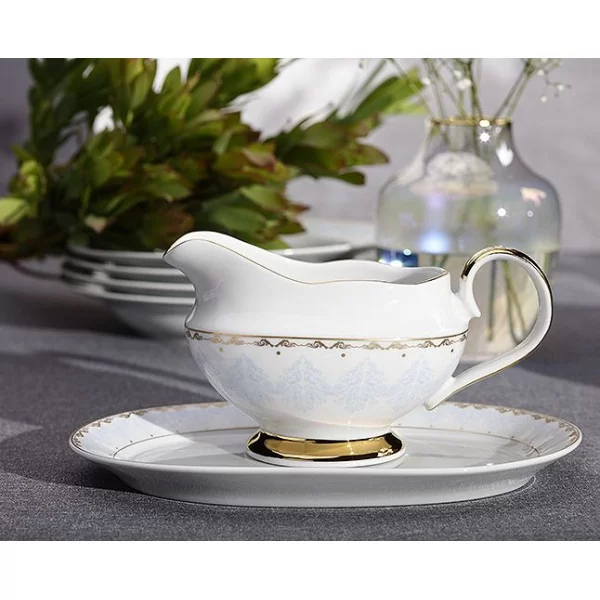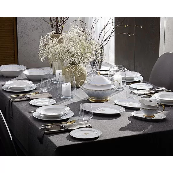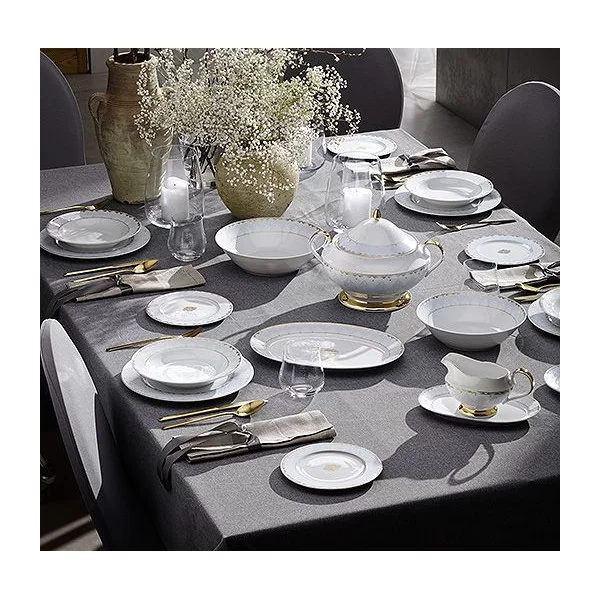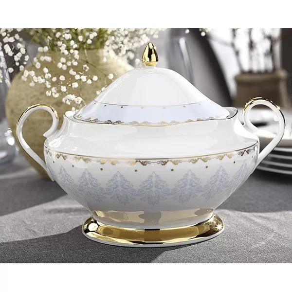 Serwis obiadowy dla 6 osób, 25-elementowy, bogato dekorowany w odcieniach błękitu i złota, z wazą w komplecie. Kolekcja stworzona dla miłośników eleganckiej i luksusowej porcelany. Serwis będzie się pięknie prezentował zarówno w klasycznych jak i nowoczesnych wnętrzach. Będzie niebanalną ozdobą stołu podczas wyjątkowych rodzinnych uroczystości.