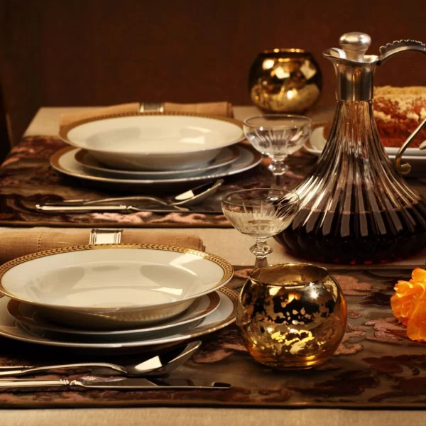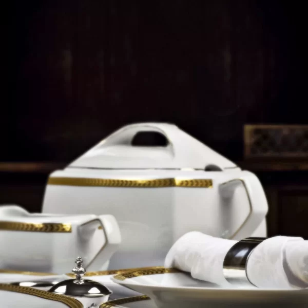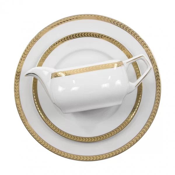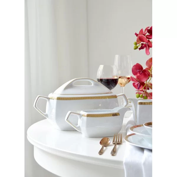 Serwis obiadowy dla 6 osób, 25-elementowy, dekorowany złotem, z wazą w komplecie. Serwis będzie piękną ozdobą stołu podczas świątecznych i uroczystych rodzinnych spotkań.