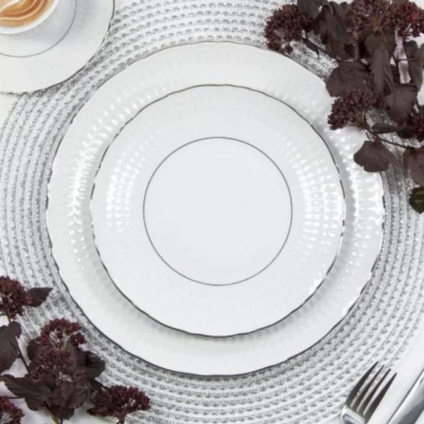 Piękny, romantyczny komplet talerzy dla 6 osób. Okrągłe kształty naczyń i geometryczny relief doskonale uzupełniają platynowe zdobienia.
