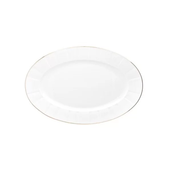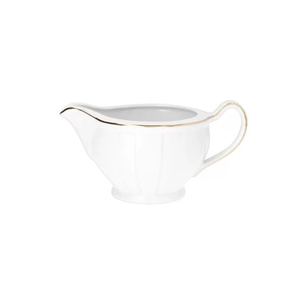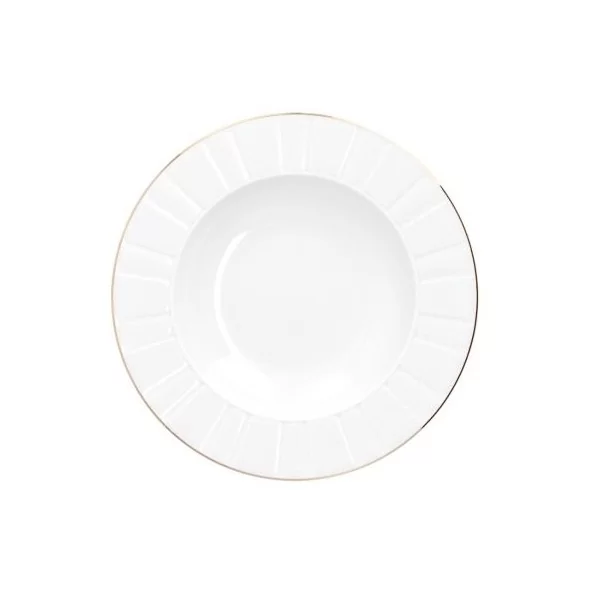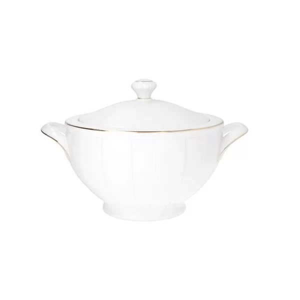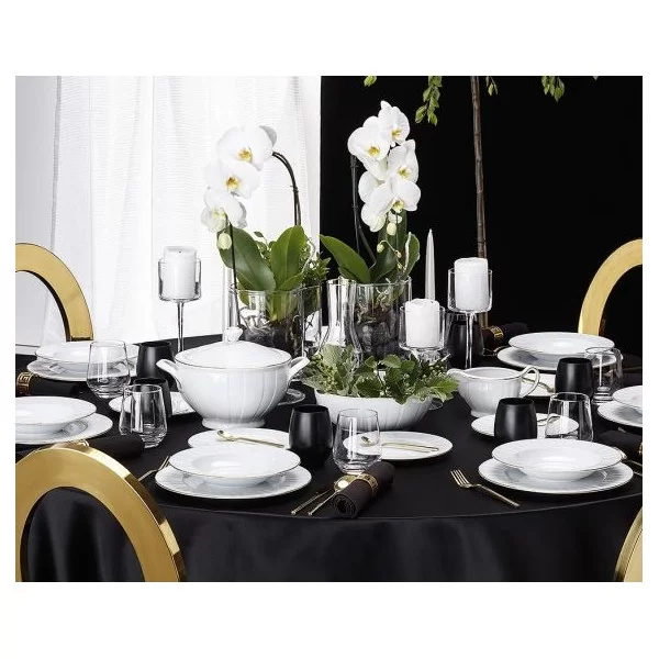 Serwis obiadowy 6-osobowy, 23 elementowy, z wazą w komplecie. Subtelny, opływowy kształt naczyń znakomicie współgra z prostymi, delikatnymi żłobieniami i eleganckim, delikatnym złotym paskiem na rancie. Serwis idealnie sprawdzi się podczas rodzinnych eleganckich przyjęć. Sam w sobie będzie piękną ozdobą stołu. Dzięki nieskazitelnej bieli jak również delikatnemu zdobieniu do serwisu będą pasowały zarówno delikatne szklanki np. z Krosna jak również cięższe kryształowe szklanki np. z Anity