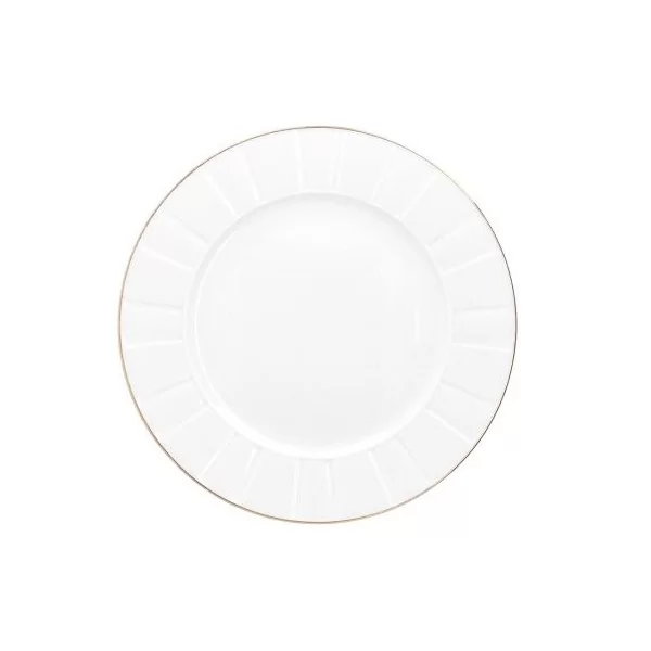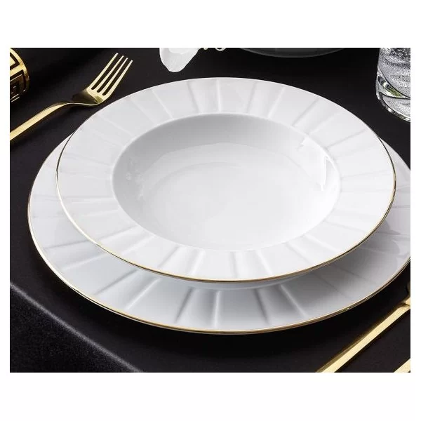 Komplet talerzy dla 6-osób w białym kolorze z delikatnymi reliefami i złotym paskiem na rancie. Subtelny, opływowy kształt naczyń znakomicie współgra z prostymi, delikatnymi żłobieniami i eleganckim, delikatnym złotym paskiem na rancie. Talerze będą pięknie się prezentować na stole podczas rodzinnego przyjęcia.