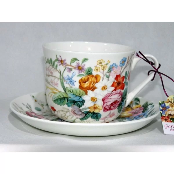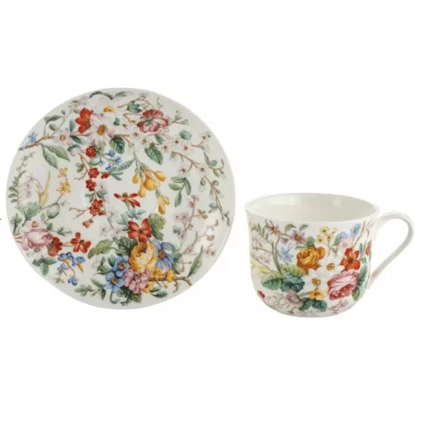 Dekorowana filiżanka o pojemności 370 ml ze spodkiem 17 cm. Wykonana z dobrej jakości porcelany kostnej "Fine Bone China"