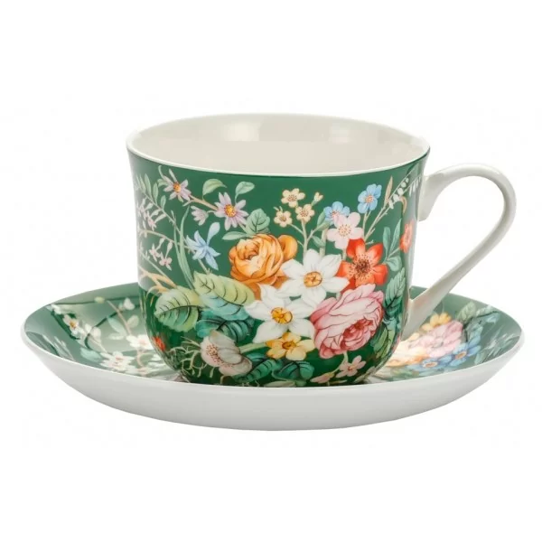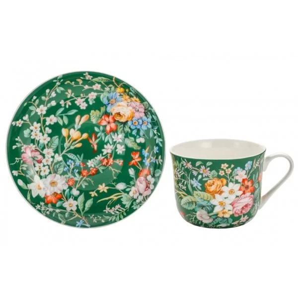 Dekorowana filiżanka w intensywnym zielonym kolorze z bogatym motywem kwiatowym. W filiżance w elegancki sposób zaserwujesz herbatę lub ulubioną kawę. Dzięki jej dużej pojemności 370 ml, dłużej będziesz mógł cieszyć się swoim ulubionym napojem. Filiżanka będzie pięknie prezentować się w jadalni w szklanej witrynie. Dzięki swojemu zdobieniu przypadnie do gustu każdemu miłośnikowi kwiatowych motywów.