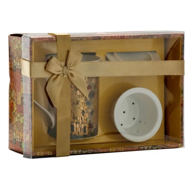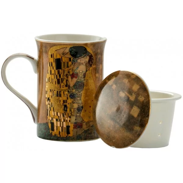 Uroczy kubek z zaparzaczem zdobiony motywem z obrazu G. Klimta - pocałunek. Wykonany z porcelany bardzo dobrej jakości. Zestaw zapakowany w prezentowe pudełko. Komplet idealnie nadaję się na prezent na różne okazje.