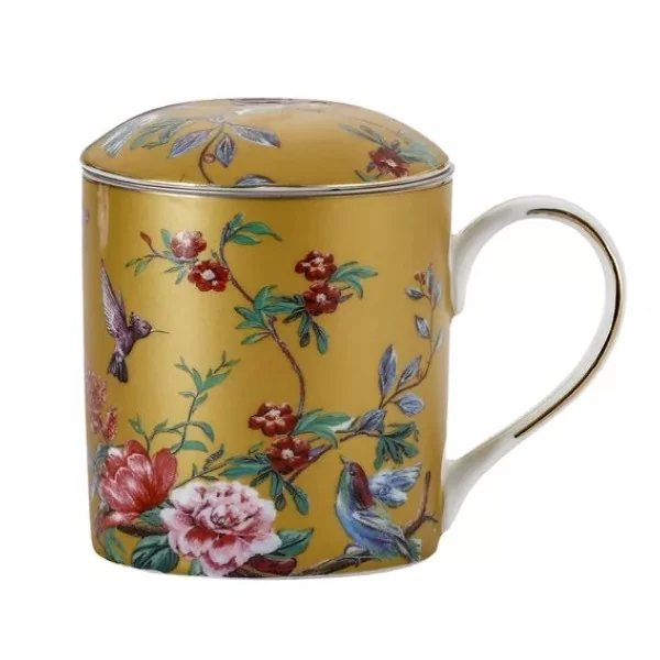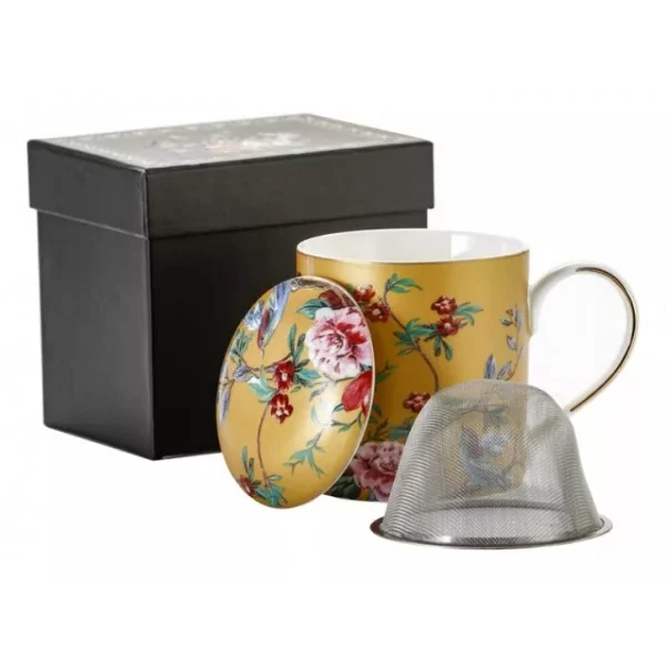 Dekorowany kubek w kolorze żółtym z kwiatową dekoracją i złotym paskiem na rantach. Kubek posiada metalowe sitko oraz porcelanową pokrywkę. W kubku z powodzeniem zaparzysz swoją ulubioną liściastą herbatę lub zioła. Korzystając z kubka bez sitka możesz zaparzyć sobie w nim ulubioną kawę.