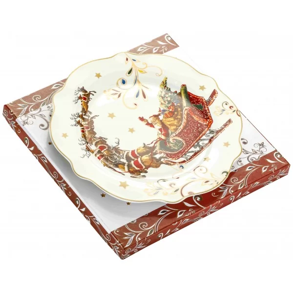 Wykonany jest z białej porcelany z piękną dekoracją Mikołaja w saniach z delikatnym złotym zdobieniem na rancie. Będzie niebanalną ozdobą każdego świątecznego stołu. Swoją dekoracją wywoła uśmiech na twarzy nie tylko wśród najmłodszych ale również na twarzach dorosłych domowników i gości.
