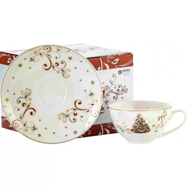 Porcelanowe filiżanki ze spodkami tzw. "Jumbo" o pojemności 350 ml z motywem Choinki. W filiżankach zaserwujesz świąteczną herbatę lub kawę albo np. ciepłe kakao z piankami dla najmłodszych.
