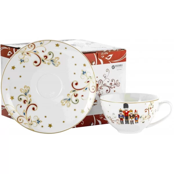 Porcelanowe filiżanki ze spodkami tzw. "Jumbo" o pojemności 350 ml z motywem Dziadka do orzechów. W filiżankach zaserwujesz świąteczną herbatę lub kawę albo np. ciepłe kakao z piankami dla najmłodszych.