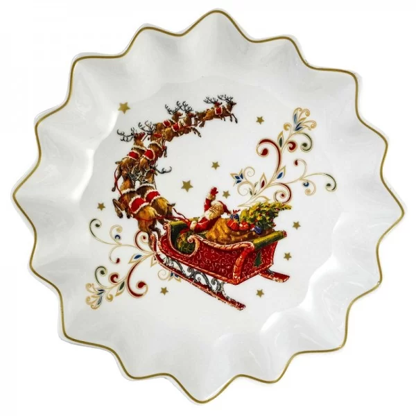 Wykonana jest z białej porcelany z piękną dekoracją Mikołaja w saniach z delikatnym złotym zdobieniem na rancie. Będzie niebanalną ozdobą każdego świątecznego stołu. Swoją dekoracją wywoła uśmiech na twarzy nie tylko wśród najmłodszych ale również na twarzach dorosłych domowników i gości.